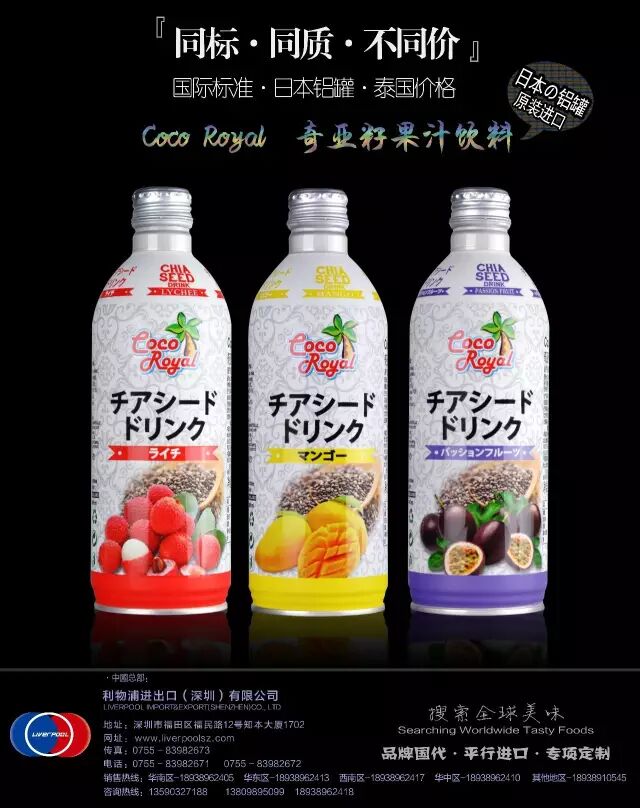 此次利物浦进出口引进的是Coco R0yal奇亚籽饮料,产品是由泰国生产,铝罐包装来自日本,Coco R0yal奇亚籽饮料经过几年的倾心打造,终于在2015年隆重登陆,在日本首发刮起了奇亚籽的健康饮品风潮。